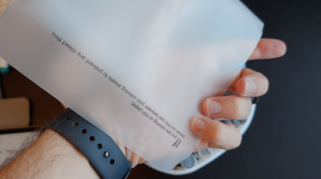 Ensuite dans la pochette, tu vas retrouver bien évidemment une feuille de protection plastique pour éviter de tâcher tes feuilles en dessous, ton bureau ou la table sur laquelle tu dessines.